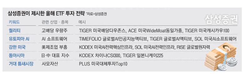 한편 삼성증권은 올해 ETF 투자 전략 키워드로 'Q.U.E.E.N'을 제시했다. 퀄리티(Quality), 유토피아 AI(Utopia AI), 강한 미국(Empowering America), 동아시아(East Plan B), 거대 틈새시장(Niche Buster)의 영어 앞 글자를 따온 말이다.