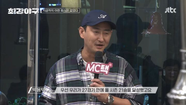 회식 도중 마이크를 잡은 박용택은 "오늘은 야구도 잘하고 기분도 좋다. 우리가 27경기 만에 올 시즌 21승을 달성했다. 1년 내내 모든 선수들, 모든 사람들 수고했다"고 '최강야구' 팀을 독려했다.