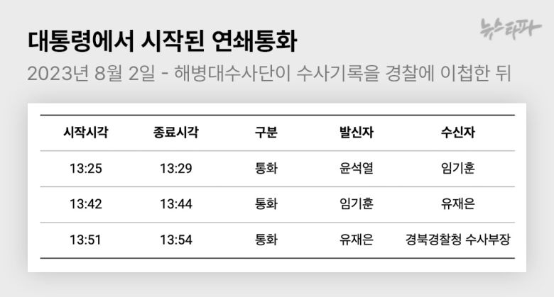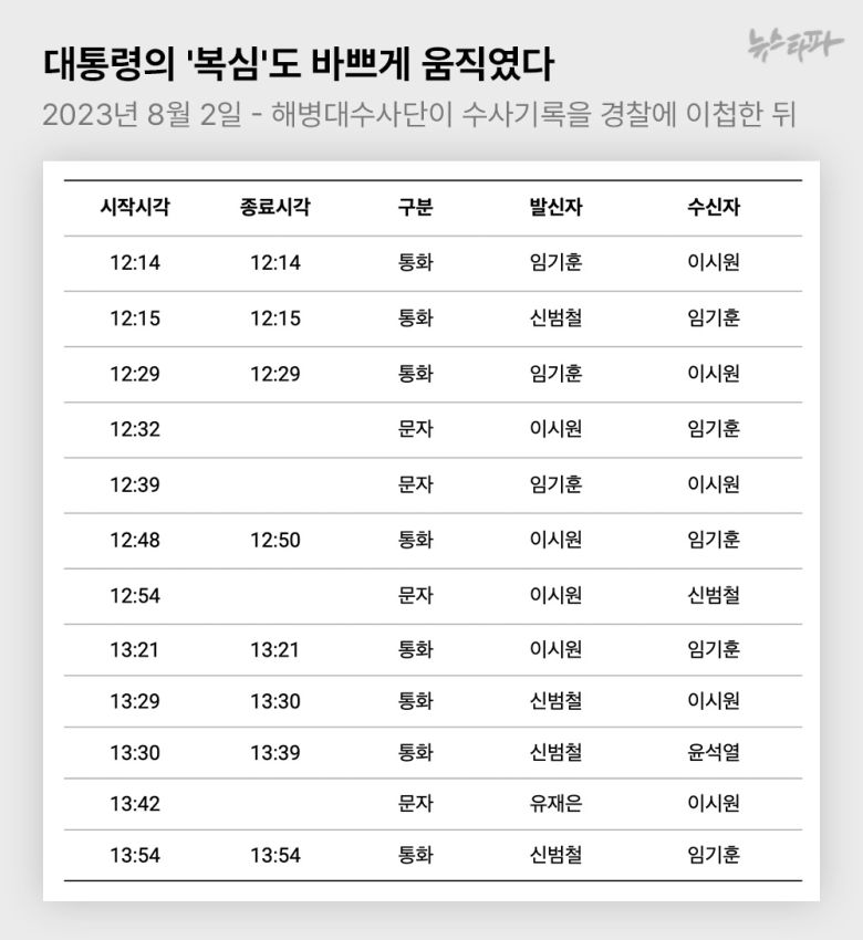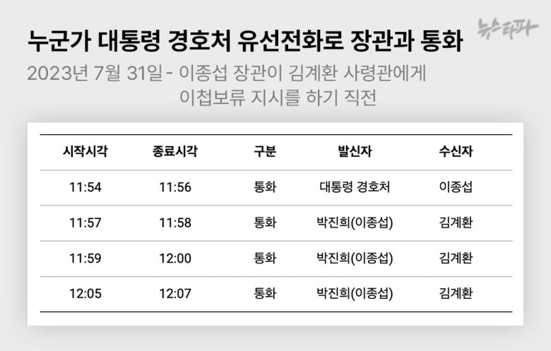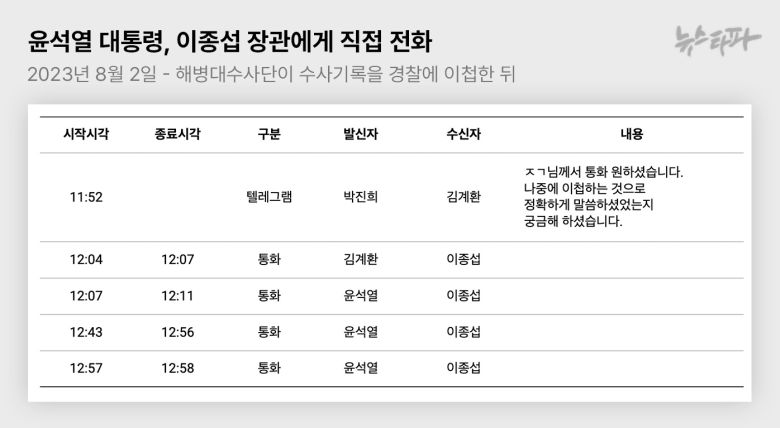 박정훈 대령 지휘로 해병대 수사단이 수사기록을 경찰로 이첩한 직후인 2023년 8월 2일 낮 12시 무렵, 윤 대통령은 개인 휴대폰으로 이종섭 전 국방부 장관에게 3차례 연달아 전화를 했다.