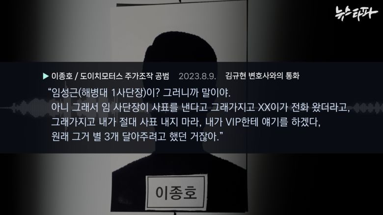 이 방에는 전직 대통령경호처 직원 송모씨, 김건희 여사의 도이치모터스 주식 계좌를 관리한 이종호 블랙펄인베스트 대표 등이 있었다. 김 변호사가 공개한 녹음 파일을 들어보면, 이들은 임성근 사단장에게 전역하거나 사표를 쓰지 말라고 만류했고, ‘VIP’에게 임 사단장의 선처를 구하려 한다는 취지의 대화를 나눴다.
