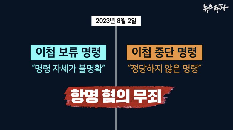 1심 재판부는 해병대 사령관이 박 대령에게 내린 명령을 두 부분으로 나눠 판단했다. 박정훈 대령이 2023년 8월 2일 채 해병 사망 원인 수사기록을 경북 경찰청에 넘겼는데, 이첩 전에 내렸다는 ‘이첩 보류 명령’, 그리고 수사기록 이첩이 시작된 후 내린 ‘이첩 중단 명령’을 나눠 심리한 것이다.