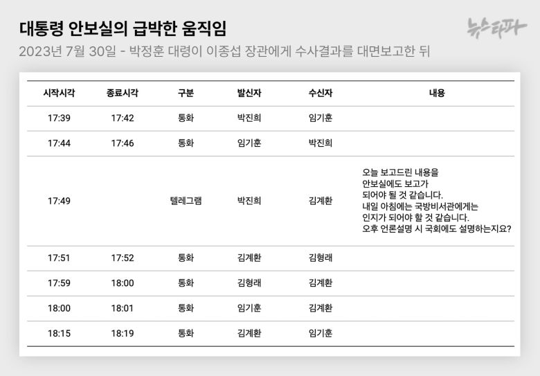 통신기록마다 대통령실 비서관들이 나선 흔적이 나왔다. 2023년 7월 30일 오후 4시 30분, 박정훈 대령은 김계환 해병대 사령관과 함께 이종섭 장관 집무실을 찾아 채 해병 사망원인 수사결과를 대면 보고하고 결재를 받았는데, 직후 임기훈 안보실 국방비서관은 박진희 국방장관 군사보좌관과 두 차례 통화했다. 또 박 보좌관은 김계환 사령관에게 ‘수사 내용이 안보실에 보고가 되어야 한다’는 취지의 텔레그램 메시지도 보냈다.