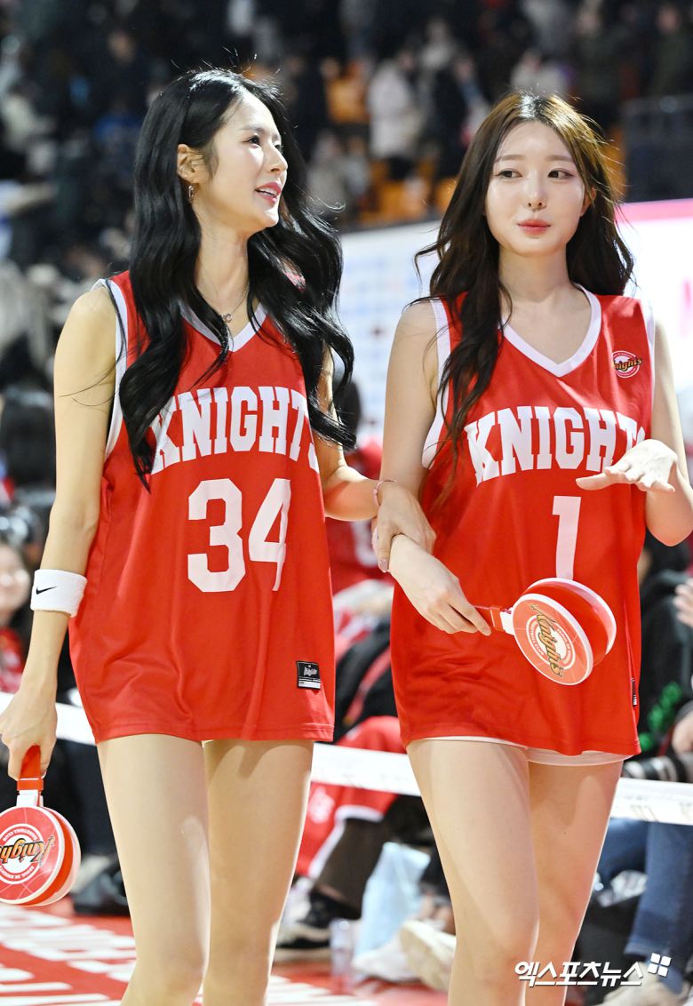 (엑스포츠뉴스 잠실학생체, 김한준 기자) 16일 오후 서울 송파구 잠실학생체육관에서 열린 '2024-2025 KCC 프로농구' 서울 SK과 원주 DB의 경기, 박기량 치어리더와 권희원 치어리더가 코트를 빠져나가고 있다.