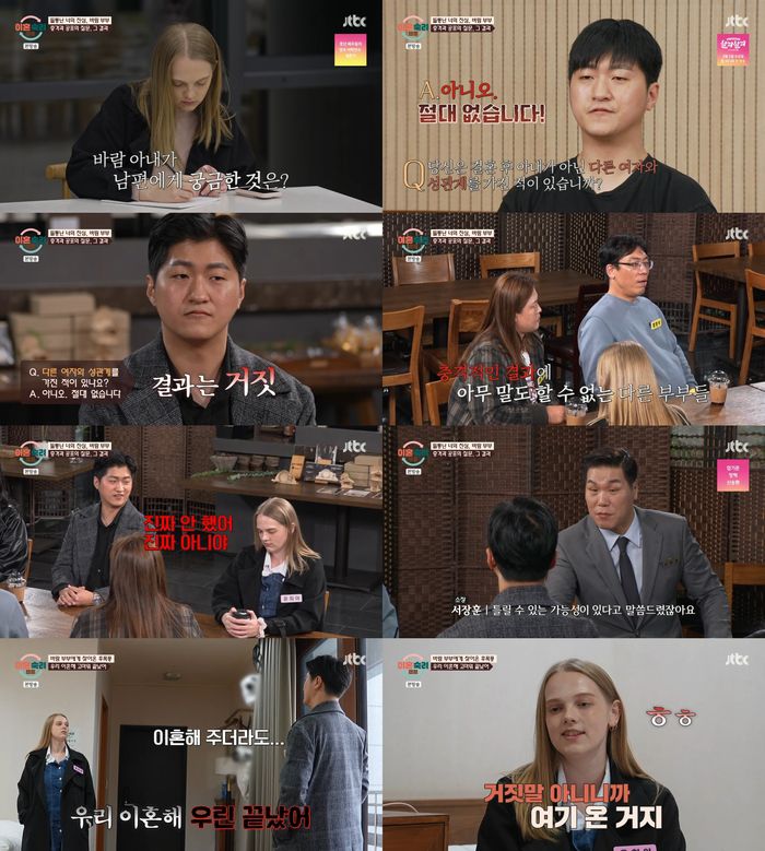 이날 바람 부부는 서로에게 묻고 싶은 질문을 써서 건넸다. 아내는 남편에게 ‘당신은 결혼 후 아내가 아닌 다른 여자와 성관계를 한 적이 있습니까?’라고 질문했다. 남편은 “아니다. 절대 없다”고 답했다.