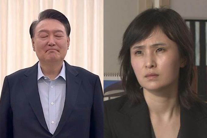 윤석열 대통령이 고위공직자범죄수사처와 경찰이 체포영장 재집행에 나선 지난 15일 관저에서 촬영된 것으로 보이는 영상을 통해 대국민 담화를 발표하고 있다. 오른쪽은 신정아 전 동국대 교수. 대통령실 제공·SBS 방송화면 캡처
