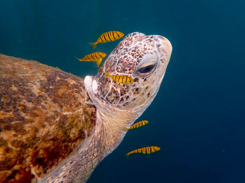 말레이시아 사바주 가야섬 바다거북과 물고기의 공생