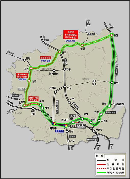 경북도는 이를 보완키 위한 촘촘한 격자형 철도망 구축 사업으로 '대구·경북 대순환 철도'와 '대구경북신공항 순환 철도'를 추진한다는 계획이다.