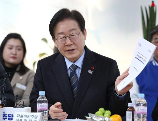 이재명 더불어민주당 대표가 지난달 1일 오후 경북 포항시 북구 죽도동 포항시전통시장상인연합회 사무실에서 열린 포항 전통시장 상인회 간담회에서 지역사랑 상품권 발행 지원 건의안을 들어 보이고 있다. 연합뉴스 |