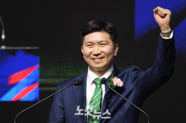 14일 서울 송파구 올림픽공원 올림픽홀에서 열린 제42대 대한체육회장선거에서 당선된 유승민 후보가 환호에 손을 들어 답하고 있다. 박종민 기자 |