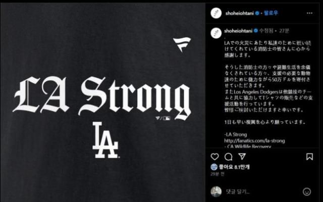 오타니는 "LA에서 발생한 화재에서 우리(시민)를 위해 계속 싸우고 있는 소방관 분들께 진심으로 감사드린다"며 "소방관 분들 및 피난 중이신 분들, 지원이 필요한 동물을 돕기 위해 미력하지만 50만 달러를 기부하겠다"고 적었다.