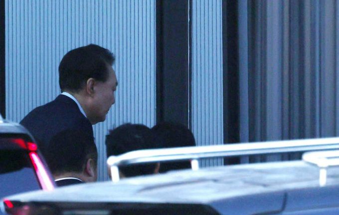 윤석열 대통령 2차 체포영장 집행이 진행된 15일 정부과천청사 공수처 청사로 윤 대통령이 출석하고 있다. 뉴시스 |