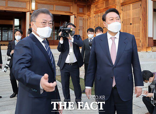 윤석열 대통령의 체포영장이 집행된 15일 문재인 전 대통령이 SNS에 "너무나 아프고 부끄러운 일이었지만 우리는 이를 새로운 시작으로 삼아야한다"라는 글을 올렸다. 지난 2022년 3월 당선자 신분이던 윤 대통령이 문 전 대통령과 만난 모습. /뉴시스