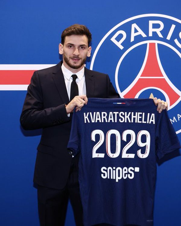 PSG는 18일(한국시각) 나폴리에서 크바라츠헬리아를 영입했다고 발표했다. 등번호는 7번이며, 계약기간은 2029년까지이다.