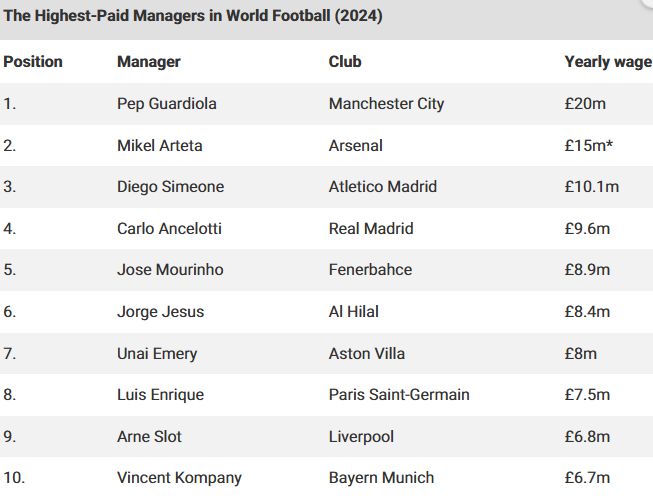 그 다음은 미켈 아르테타 아스널 감독으로 1500만 파운드(약 266억원) 상당의 연봉을 받는 것으로 알려졌다. 이어 아틀레티코 마드리드의 디에고 시메오네 감독이 1010만 파운드(약 179억원)를 받는다. 여기까지가 1000만 파운드 이상의 연봉을 받는 감독 리스트다.