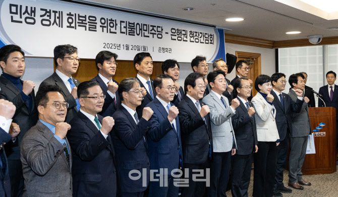 [이데일리 김태형 기자] 이재명 더불어민주당 대표가 20일 오후 서울 중구 은행연합회관에서 열린 '민생경제 회복을 위한 더불어민주당-은행권 현장간담회'에 참석해 조용병 은행연합회장을 비롯한 주요 은행장들과 기념촬영하고 있다.
