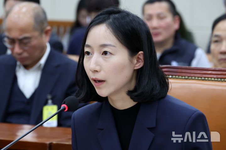 [서울=뉴시스] 조성우 기자 = 박은진 대유에이텍 부사장(박영우 회장 차녀)이 21일 서울 여의도 국회에서 열린 환경노동위원회의 쿠팡 택배노동자 심야노동 등 근로조건 개선을 위한 청문회에서 의원 질의에 답변하고 있다. 2025.01.21. xconfind@newsis.com