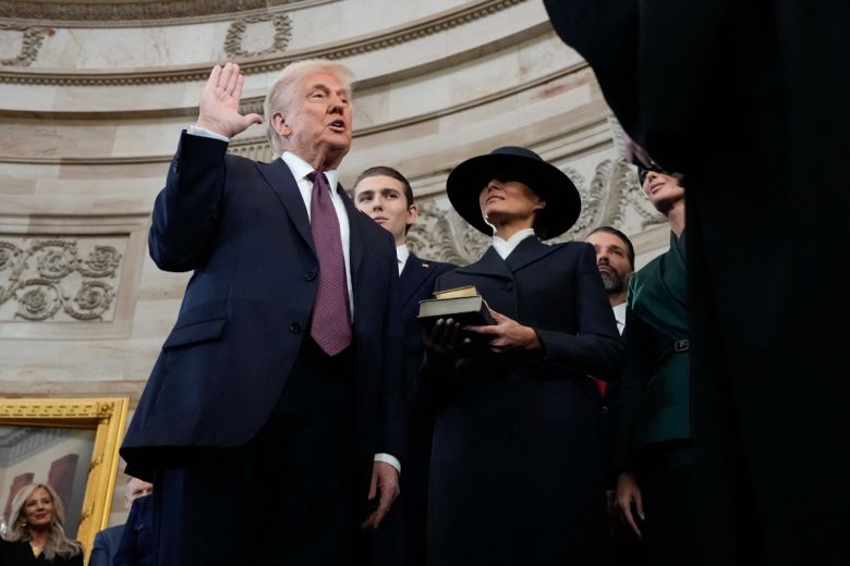 공식 취임을 알리는 선서에서 트럼프 대통령은 에이브러햄 링컨 전 대통령의 성경과 모친에게 받은 성경 두 권을 준비했지만 성경에 손을 얹지는 않았다. 신임 대통령이 취임 선서를 할 때 성경에 손을 올리는 것은 일반적이지만 법적 의무 사항은 아니다. ABC뉴스는 “트럼프 대통령이 성경에 손을 대지 않고 취임 선서를 한 최초의 대통령은 아니다”며 “적어도 4명이 성경 없이 선서했다”고 짚었다.