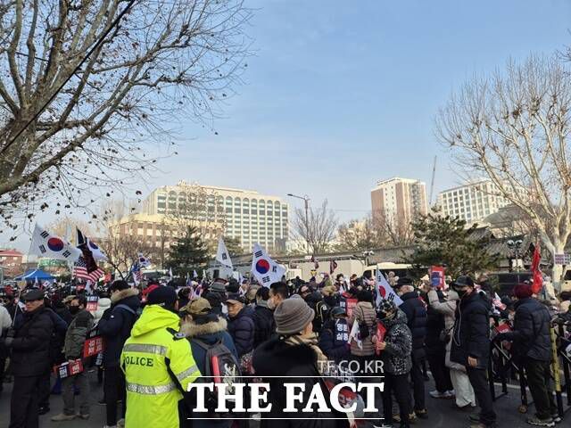 시위대는 '명분실종 탄핵무효', '탄핵무효 이재명 구속' 등이 적힌 피켓을 들고 태극기와 성조기를 흔들었다. 빨간 모자를 쓰고 빨간 목도리를 두른 이들도 있었고, '탄핵기각'이 적힌 우산을 들고 나온 시민도 있었다. 오후 1시10분께 윤 대통령이 탄핵심판 변론에 출석하기 위해 헌재에 도착했다는 소식에 시위대는 "대통령 오셨다"며 환호했다.