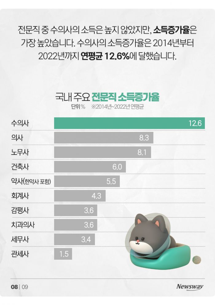 전문직 중 수의사의 소득은 높지 않았지만, 소득증가율은 가장 높았습니다. 수의사의 소득증가율은 2014년부터 2022년까지 연평균 12.6%에 달했습니다.