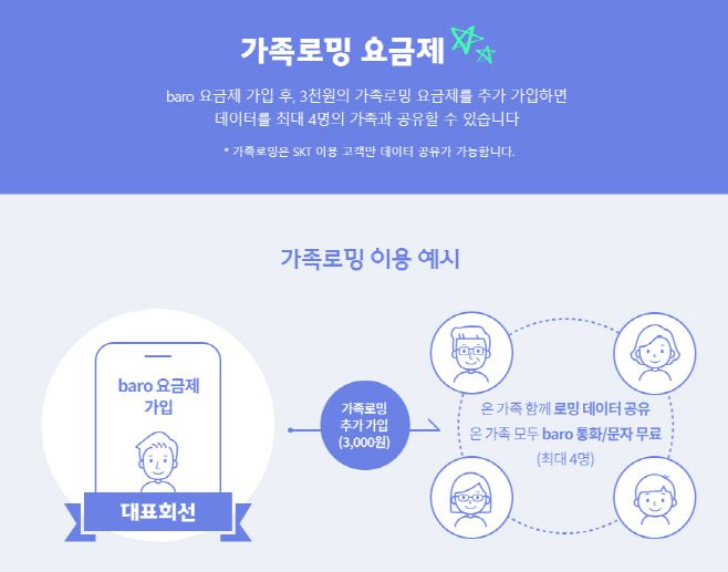 가족로밍은 바로(baro) 요금제에 가입한 가족대표 1명이 3000원만 추가해 가입하면 모든 가족(대표 포함 최대 5명)이 로밍 데이터를 함께 사용할 수 있는 서비스다. 예를 들어 3인 가족의 경우 한 명이 대표로 6GB 상품과 가족로밍을 4만2000원(6GB 상품 3만9000원+가족로밍 3000원)에 가입하면 가족 3명이 30일간 6GB의 데이터를 나눠 쓸 수 있다. 이 경우 1인당 금액은 1만4000원으로 요금 부담이 크게 낮아진다. 아울러 가족로밍을 이용하는 모든 구성원은 에이닷 전화를 이용한 바로(baro) 음성통화와 문자도 무료로 사용할 수 있다.