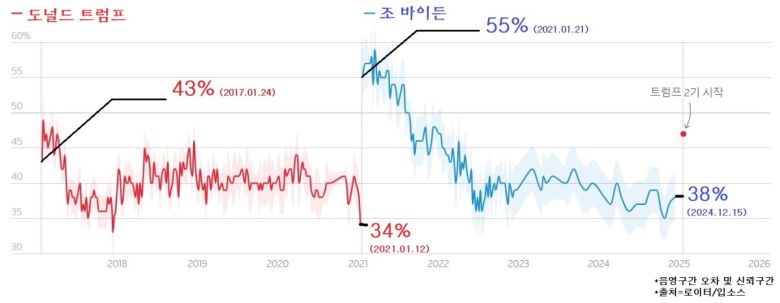 트럼프 1기 행정부는 2017년 1월 지지율은 43%로 출발했다. 2기 행정부 지지율은 이보다 4%포인트(p) 상승한 가운데 출범했다. 다만 로이터통신은 “대부분의 미국 대통령의 취임 직후 지지율보다 트럼프 2기 행정부의 지지율이 상대적으로 낮다”라고 전했다.