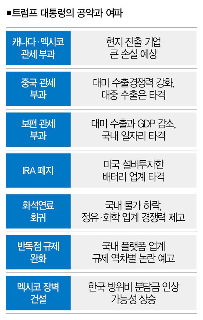 이밖에도 트럼프 2기 행정부의 출범에 발맞춰 우리가 신경 써야 할 것들은 숱하다. 미국 풍력시장 보조금 폐지로 인한 국내 풍력 업체들의 수출 감소, 러시아-우크라이나 전쟁 종식을 위한 개입과 재건 프로젝트 참여 확대, 오바마케어 폐지에 따른 서민층의 의약품 수요 감소와 국내 제약업체의 타격 등의 여파도 따져봐야 한다.