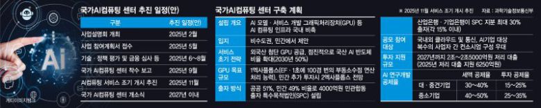 민관 합작투자를 통해 SPC를 설립하고, 정책금융대출 등을 활용해 1엑사플롭스(EF·1초에 100경번의 부동소수점 연산처리 능력) 이상 국가AI컴퓨팅센터를 설립한다. SPC 지분은 공공 51%, 민간 49%로 총 4000억원을 출자하며 올해 서비스 조기 개시가 목표다. 산업은행, 기업은행이 SPC 지분의 최대 30%(각 15% 이내)를 출자한다. 2027년까지 투자금 2조~2조5000억원을 정책금융을 통한 저리로 빌려주는데, 올해 대출지원 규모는 최대 6250억원이다.