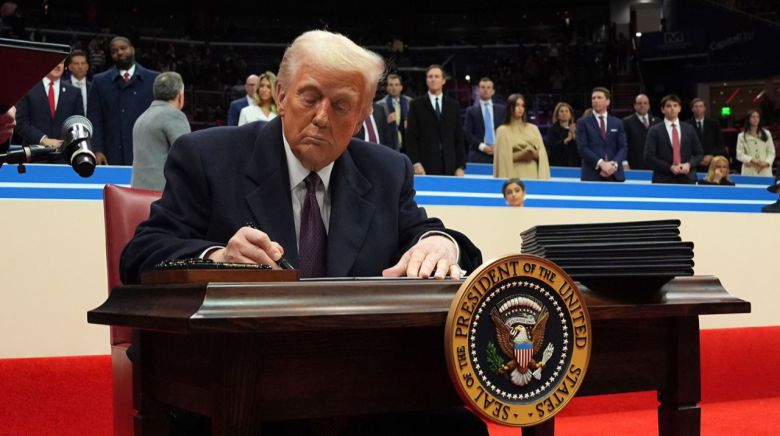 도널드 트럼프 대통령이 취임식이 열린 지난 20일 약 2만명이 모인 워싱턴DC ‘캐피털 원 아레나’ 경기장에 마련된 책상에 앉아 행정명령에 서명하고 있다. [AFP] |