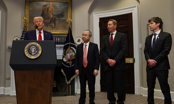 ‘AI 삼총사’ 앞에서… 5000억弗 투자 발표 도널드 트럼프 미국 대통령이 취임 다음날인 21일(현지시간) 워싱턴 백악관에서 5000억달러(약 718조원) 규모의 인공지능(AI) 인프라 투자를 발표하고 있다. AI 기술 개발 주도권을 놓고 국가 간 경쟁이 치열해지는 가운데 ‘미국 중심의 AI 생태계’를 만들겠다는 의지를 내비친 것으로 풀이된다. 왼쪽부터 트럼프 대통령, 손정의 소프트뱅크 회장, 래리 엘리슨 오라클 회장, 샘 올트먼 오픈AI 최고경영자. 워싱턴=로이터연합뉴스 |