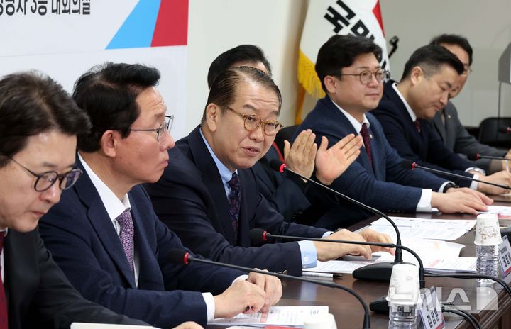 [서울=뉴시스] 조성봉 기자= 권영세 국민의힘 비상대책위원장이 22일 오전 서울 여의도 중앙당사에서 열린 시도당위원장 회의에서 발언을 하고 있다. 2025.01.22. suncho21@newsis.com