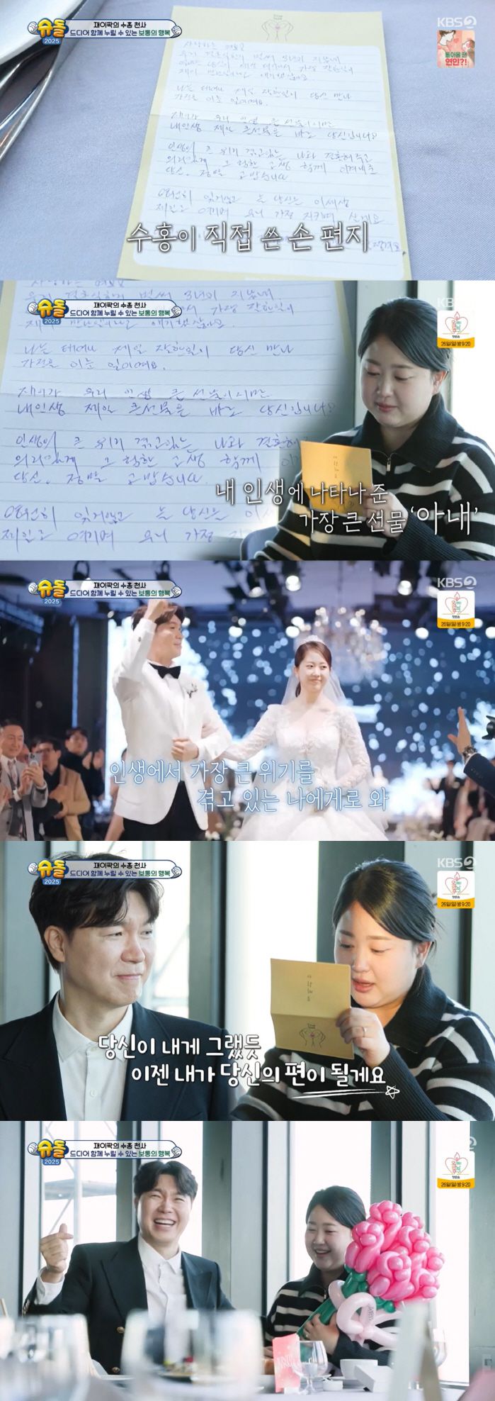 이어 김다예는 박수홍이 건넨 편지를 읽으며 감격의 순간을 만끽했다. 박수홍이 쓴 편지에는 "사랑하는 여보. 우리가 결혼한 지 벌써 3년이 지났어. 얼마전 당신이 태어나 제일 잘한 일이 재이를 만난 일이라고 했는데, 난 태어나 잘한 일이 당신을 만나 가정을 이룬 일이다"라며 "재이가 우리 인생 큰 선물이지만 내 인생 제일 큰 선물은 당신이다. 인생에서 큰 위기를 겪고 있는 나와 결혼해주고, 의리있게 함께 이겨낸 당신 고맙다. 당신에게 무슨 일이 생기든 당신이 그랬듯 나도 당신의 편이다"라고 적혀 있어 감동을 안겼다.