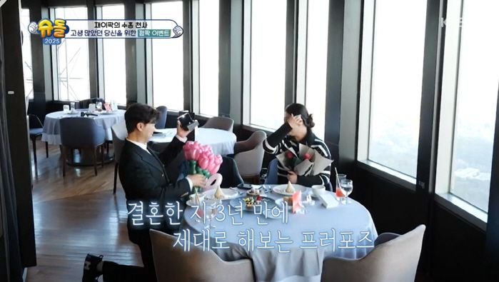 그러던 중 뒷자리에서 식사 중인 커플이 큰소리를 다투기 시작했다. 김다예가 당황한 순간, 커플과 직원이 함께 노래를 부르기 시작했다. 박수홍이 준비한 깜짝 이벤트였던 것. 박수홍은 꽃다발과 반지를 들고 나와 김다예에게 무릎 꿇었다. 박수홍은 눈물을 흘리며 김다예에게 반지를 건넸고, 김다예도 "왜 본인이 우냐"면서 함께 눈물을 흘렸다.