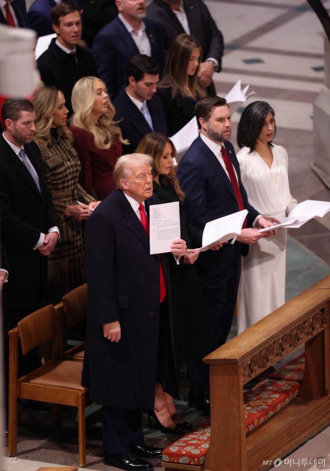 (워싱턴 AFP=뉴스1) 우동명 기자 = 도널드 트럼프 미국 대통령이 21일(현지시간) 워싱턴 워싱턴국립대성당에서 열린 국가 기도회에 부인 멜라니아 여사, JD밴스 부통령 부부와 참석을 하고 있다. 2025.01.22  ⓒ AFP=뉴스1  Copyright (C) 뉴스1. All rights reserved. 무단 전재 및 재배포,  AI학습 이용 금지. /사진=(워싱턴 AFP=뉴스1) 우동명 기자