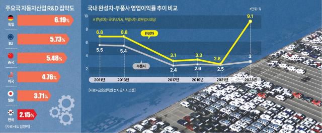 국내 자동차 부품에 대한 연구개발(R&D) 집약도가 글로벌 부품사보다 뒤처진 것으로 나타났다. 전기차로의 급격한 흐름 전환에 기민하게 대응하지 못한 부품사들은 자국 부품을 사용하라는 미국의 요구와 중국의 미래차 공세에 따라 버틸 재간이 없는 처지다. 자동차 산업 생태계의 핵심인 부품업체의 위기는 자동차 산업의 붕괴를 초래할 수 있다는 우려가 나온다.