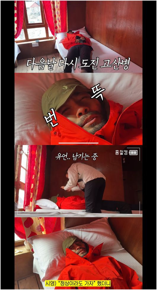 노홍철은 갑작스럽게 컨디션 난조를 느끼며 쉴 새 없이 먹었고, 배탈이 났다. 그러다 실신까지 한 그는 산소포화도 측정까지 해야 했다. 이런 노홍철의 병명은 바로 고산병이었다. 고산병은 높은 산에 올라갔을 때 낮아진 기압 때문에 일어나는 병으로, 증상은 두통이나 구토 등 다양하다.