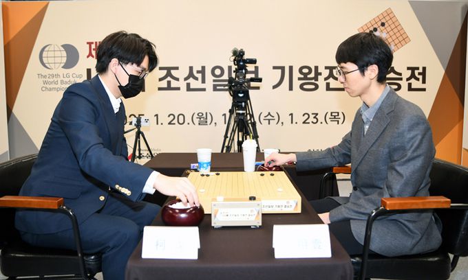 22일 서울 성동구 마장로 한국기원 신관에서 열린 제29회 LG배 조선일보 기왕전 결승 3번기 2국에서 변상일(오른쪽)과 중국 커제가 대국을 펼치고 있다. 한국기원 제공