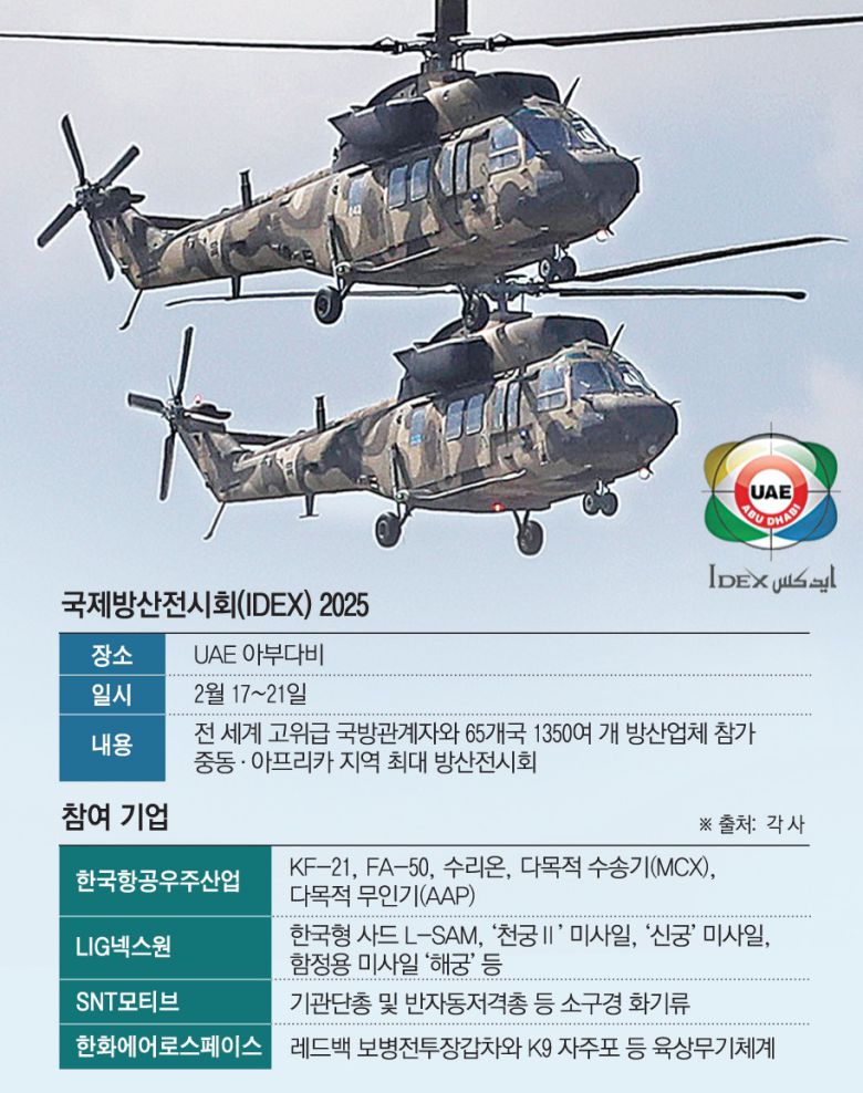 23일 방위산업계에 따르면 한국항공우주산업(KAI), LIG넥스원, 한화, 현대로템 등 38개 국내 방산업체들은 내달 17일~21일 아랍에미리트(UAE) 아부다비 국제전시컨벤션센터(ADNEC)에서 열리는 IDEX 2025에 참가한다.