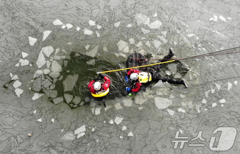 평년기온을 웃도는 포근한 날씨가 이어진 22일 오후 대구 달성군 하빈저수지에서 대구강서소방서 119구조대원들이 동계 수난사고 대비 특별구조훈련을 실시하고 있다. 2025.1.22/뉴스1 ⓒ News1 공정식 기자 |