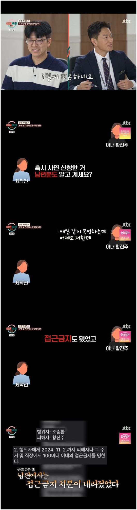 실제로 프로그램 참여 전 제작진에게 참가 신청을 한 황진주는 전화 통화 중 오열했다. 제작진은 “혹시 사연 주신 것 남편분도 주신 거 알고 계시냐”라고 물었고, 이에 황진주는 울어버린 것. 황진주는 “남편이 매일 같이 폭언을 하는데, xxx라는 등, 심적으로 조금 힘들어서 울고 있었다. 말하기 창피한데, 남편이 신청 2주 전에 접근금지도 됐었다. 몸에 불을 지르려고 하더라”라고 말해 제작진을 놀라게 만들었다.