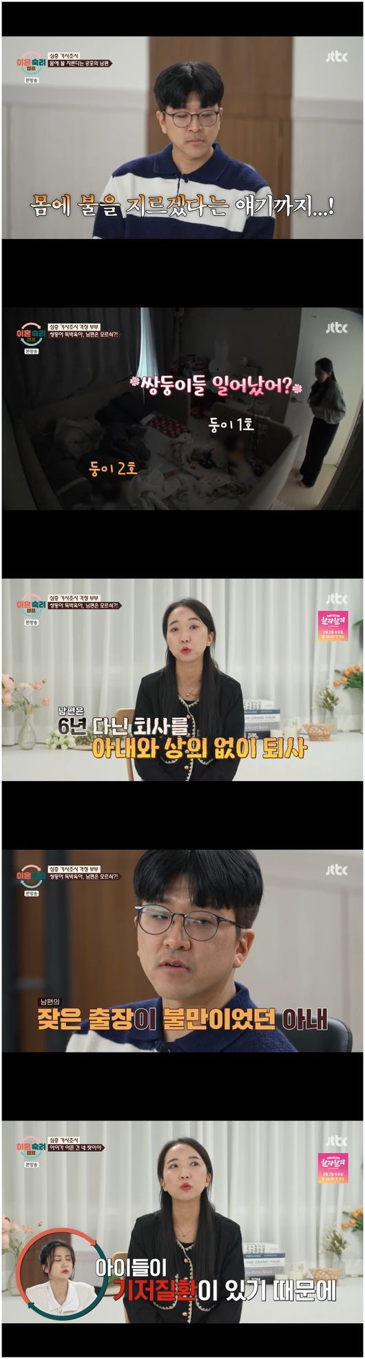 그러나 남편 쪽의 영상이 공개되자 분위기는 조금 바뀌었다. 하루 12시간 내내 근무하고 온 남편에게 아내는 육아 퇴근 후 쉴 새 없이 잔소리를 한 것이었다. 육아에 있어서 쉬지도, 저녁 밥을 먹지도 못한 채 내내 쌍둥이를 돌보던 남편은 끝내 폭발하고 말았다.