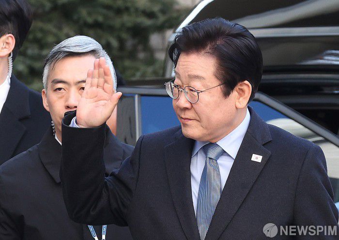 [서울=뉴스핌] 이호형 기자 = 이재명 더불어민주당 대표가 23일 오후 서울 서초구 서울고등법원에서 열린 '공직선거법 위반 혐의'에 대한 항소심 1차 공판에 출석하며 지지자를 향해 손 인사를 하고 있다. 2025.01.23 leemario@newspim.com |