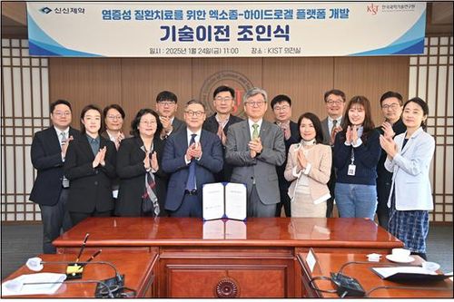 (서울=연합뉴스) 조승한 기자 = 한국과학기술연구원(KIST)은 24일 서울 성북구 KIST 본원에서 신신제약[002800]과 염증성 질환 치료를 위한 엑소좀 하이드로겔 플랫폼 기술이전 협약식을 열었다고 밝혔다.