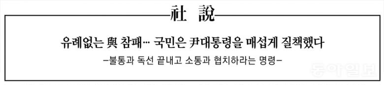그래서 2024년 1월 1일부터 12·3 사태 전까지 동아일보 사설을 찾아봤다. 제목만 훑어봐도 가슴이 무너진다. 대통령이 그때그때 사설을 보고 손톱만큼이라도 반응했다면, 이 지경까진 안 왔을 게 분명했다. 그 중에서도 4월 총선 직전까지 대통령 관련 사설을 보면 왜 대패했는지 누구라도 알 수 있다.