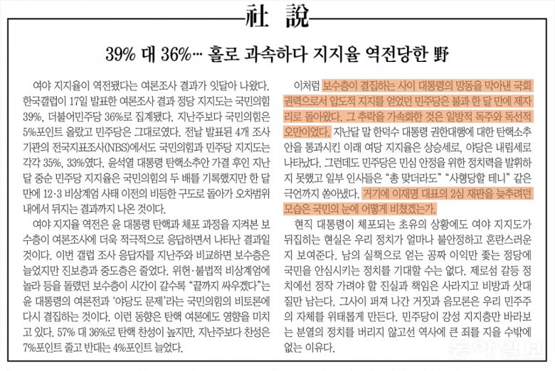 | “(중략)보수층이 결집하는 사이 대통령의 망동을 막아낸 국회 권력으로서 압도적 지지를 얻었던 민주당은 불과 한 달 만에 제자리로 돌아왔다. 지난달 말 한덕수 대통령 권한대행에 대한 탄핵소추안을 통과시킨 이래 여당 지지율은 상승세로, 야당은 내림세로 나타났다. 그 추락을 가속화한 것은 일방적 독주와 독선적 오만이었다…(중략) 거기에 이재명 대표의 2심 재판을 늦추려던 모습은 국민의 눈에 어떻게 비쳤겠는가.” |
