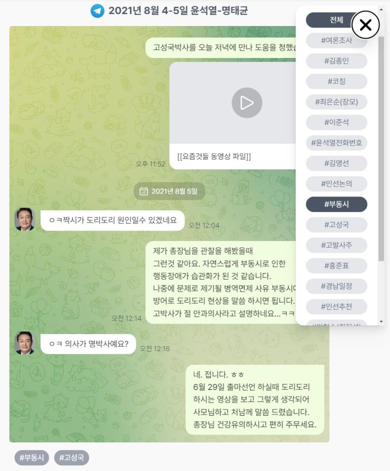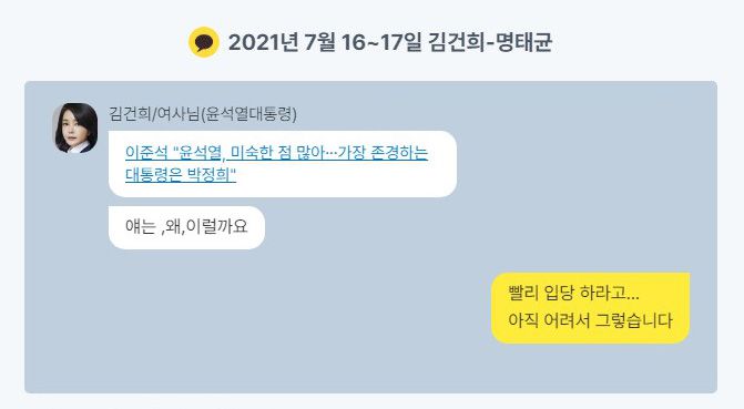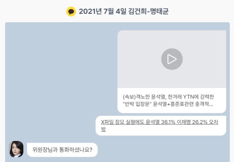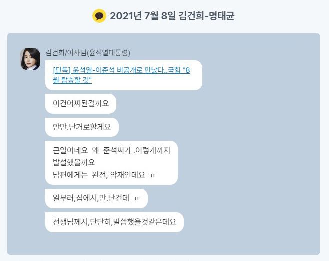 새로 복원·공개된 대화 내용을 보면 윤석열은 명태균의 조언에 따라 정치인들과 통화하며 명태균에게 ‘체리따봉’을 보내기도 했다. 김건희는 대통령 선거 준비 과정에서 명태균에게 크게 의존하는 모습을 보였다. 명태균은 이준석 전 국민의힘 대표나 김종인 전 비상대책위원장과의 회동을 조율하는 등 윤석열 부부의 정치 입문 과정에 깊이 개입했다. 이 과정에서 김건희는 이준석에 대한 기사를 공유하며, 답답한 심정을 토로하기도 했다.
