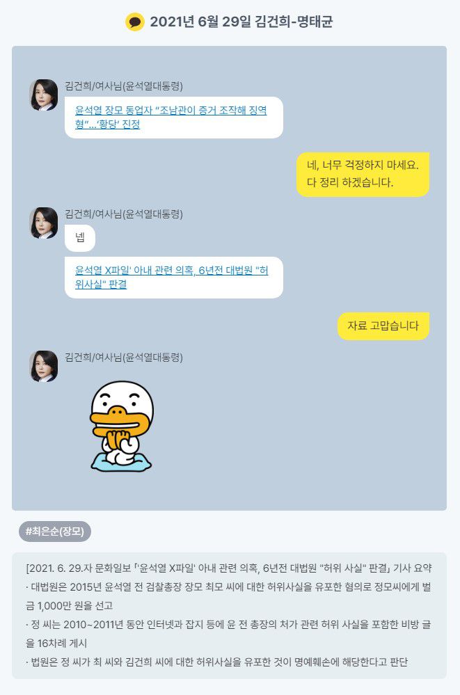 4. 메시지 창 하단의 텍스트는 수사 보고서에 포함돼 있는 ‘참고 사항’으로, 수사관이 대화의 이해를 돕기 위해 첨부한 기사 요약 및 사실 확인 내용이다.