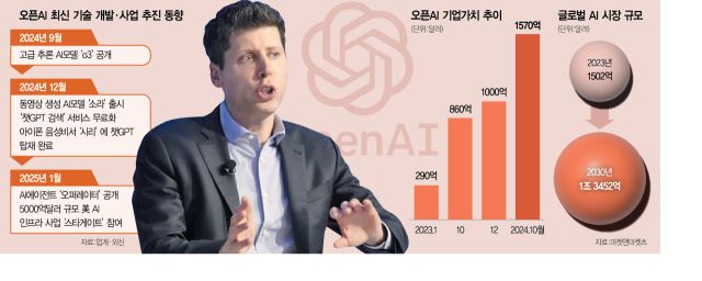 2022년 11월 챗GPT를 출시하며 생성형 AI 시대를 연 오픈AI는 몸집을 계속해서 키우며 전 세계에서 독보적인 AI 기업으로 성장했다. 지난해 10월 오픈AI는 66억 달러(9조 4000억 원)의 투자를 추가로 유치하며 약 1570억 달러(224조 6000억 원)의 기업가치를 인정받았다. 21일(현지 시간)에는 소프트뱅크·오라클 등과 합작회사를 설립해 앞으로 4년간 미국 AI 인프라에 최소 5000억 달러(약 717조 원)를 투자하겠다는 계획을 밝혀 전 세계를 놀라게 했다.