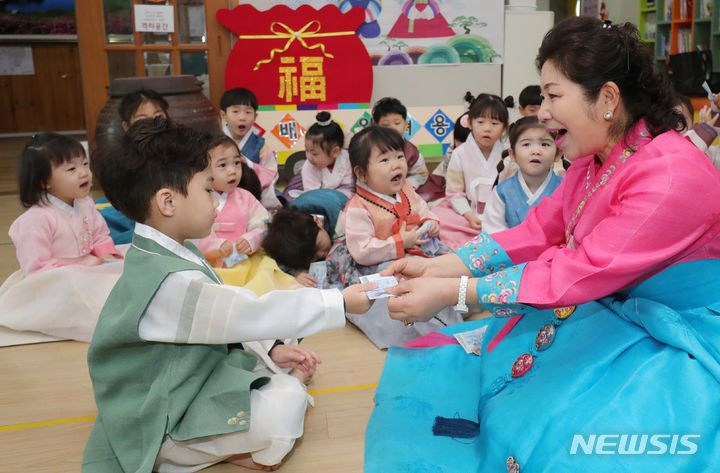 [전주=뉴시스] 김얼 기자 = 민족의 대 명절인 설날을 앞둔 7일 전북 전주시 이계순동화속어린이집에서 어린이들이 세배를 마치고 세뱃돈을 받고 있다. 2024.02.07. pmkeul@nwsis.com