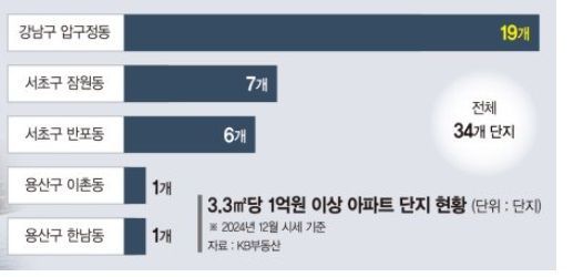 KB부동산 통계에 따르면 지난해 12월 기준으로 평균 아파트 매매가가 3.3㎡당 1억원 이상 아파트는 전국서 34개 단지로 집계됐다. 지역별로 보면 서울의 특정 지역에 집중돼 있다. 강남구 압구정동, 서초구 반포동·잠원동, 용산구 이촌동·한남동 등이 주인공이다.