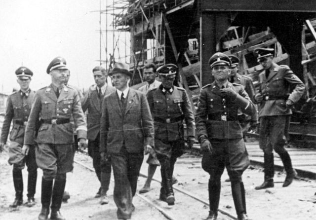 ▲ IG 파르벤은 아우슈비츠 수용소에 독가스 치클론 B를 공급했던 전범기업이다. 1942년 7월 IG 파르벤 공장 건설 현장을 돌아보는 친위대 사령관 힘러, IG 파르벤 임원 막스 파우스트, 아우슈비츠 수용소장 루돌프 회스(앞줄 왼쪽부터). ⓒ위키미디어 |